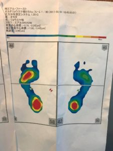 画像の様に足の裏のどこに1番荷重がかかっているか、特殊な機械で計測し、足の細かいサイズも計測して作ります。
