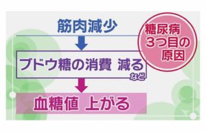 筋肉が減ると、筋肉のブドウ糖消費量が減って血糖値が上がりやすくなるため、糖尿病が悪化しやすいのです。